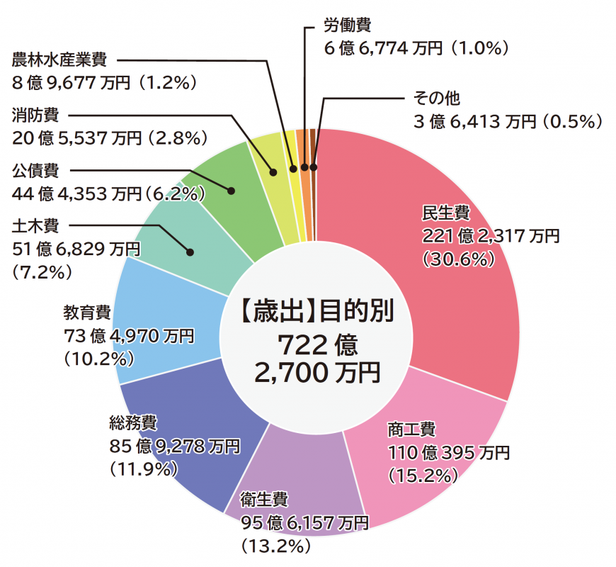一般会計の歳出(目的別)のうち、全体で最も多い30.6%を占める民生費は、「民間保育所等給付費」や「障害者自立支援給付事業費」などの増額により、前年度に比べ11億5,602万円(5.5%)増の221億2,317万円としました。衛生費は、「志太広域事務組合ごみし尿処理施設運営事業費」などの増額により、前年度に比べ9億3,688万円(10.9%)増の95億6,157万円としました。教育費は、「小学校猛暑災害対策事業費」などの減額により、前年度に比べ10億9,234万円(12.9%)減の73億4,970万円としました。市の借金の返済に当たる公債費は、前年度に比べ3億4,837万円(8.5%)増の44億4,353万円としました。