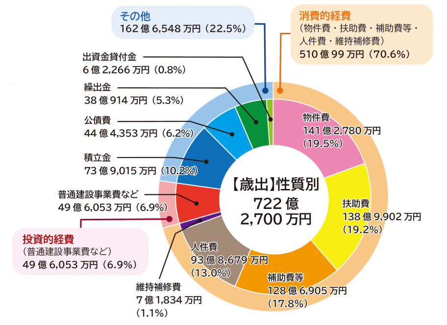 消費的経費(物件費・扶助費・補助費等・人件費・維持補修費)…510億99万円(70.6%)