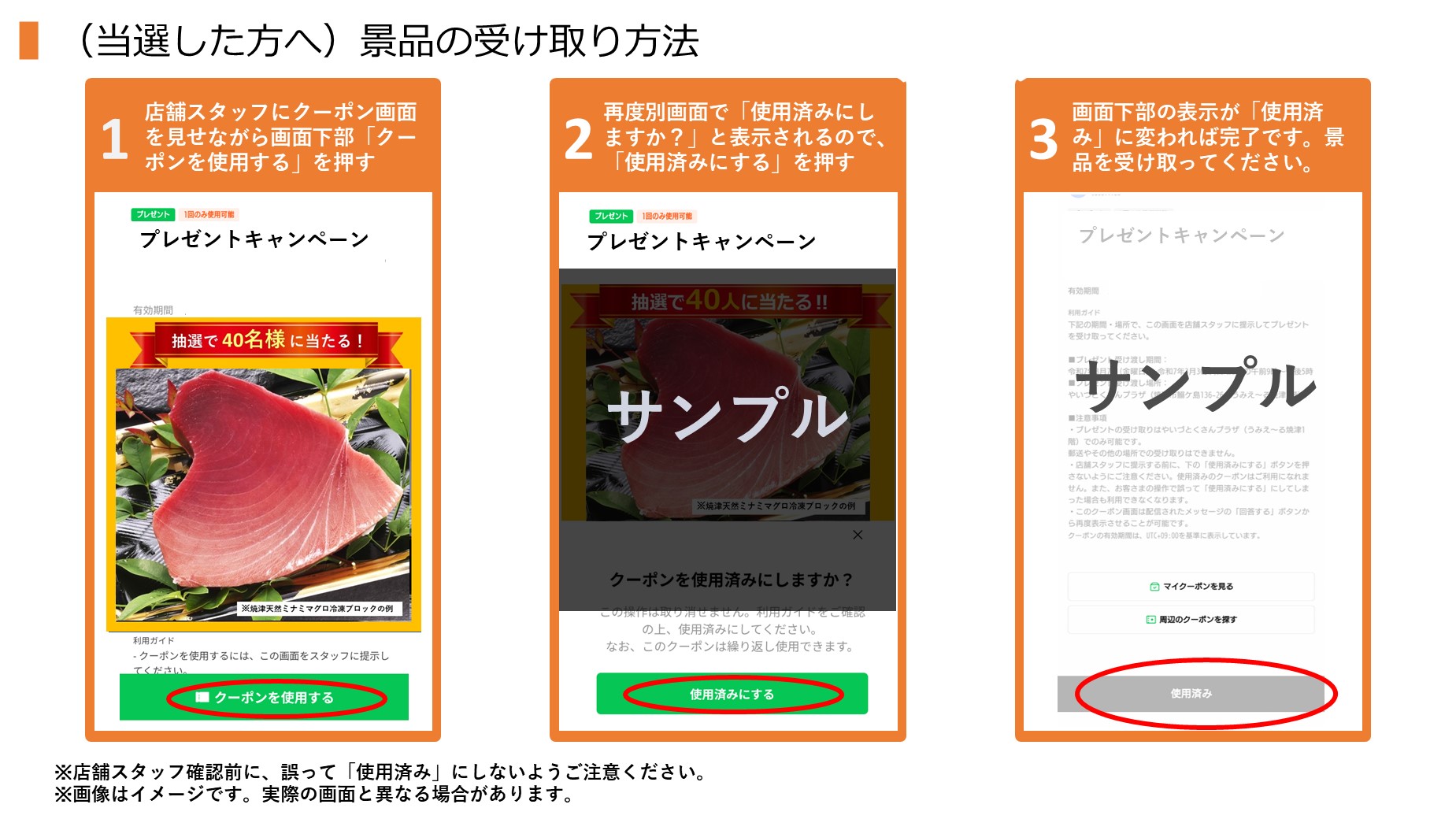 - クーポンが使用済みになったことを確認してプレゼントをお渡しします