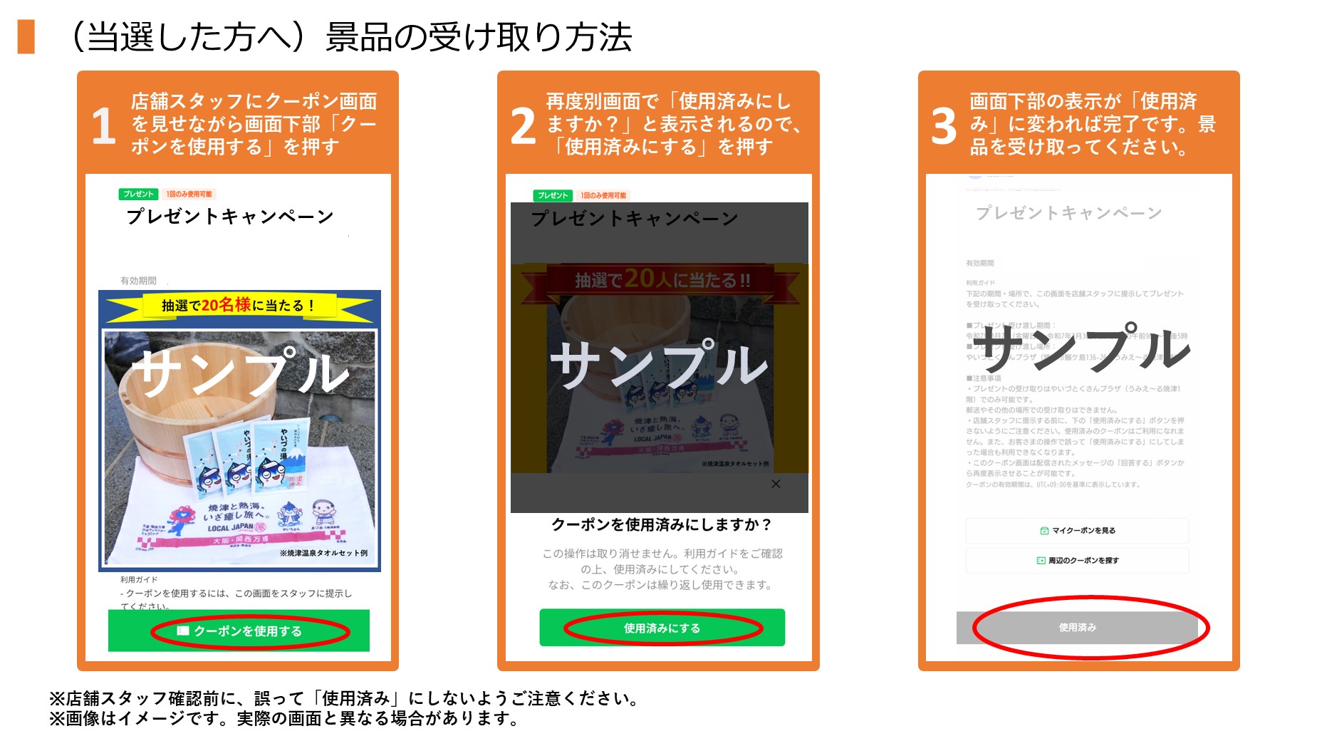 - 焼津市観光協会でクーポン画面を確認できない場合は、景品をお渡しできません。
