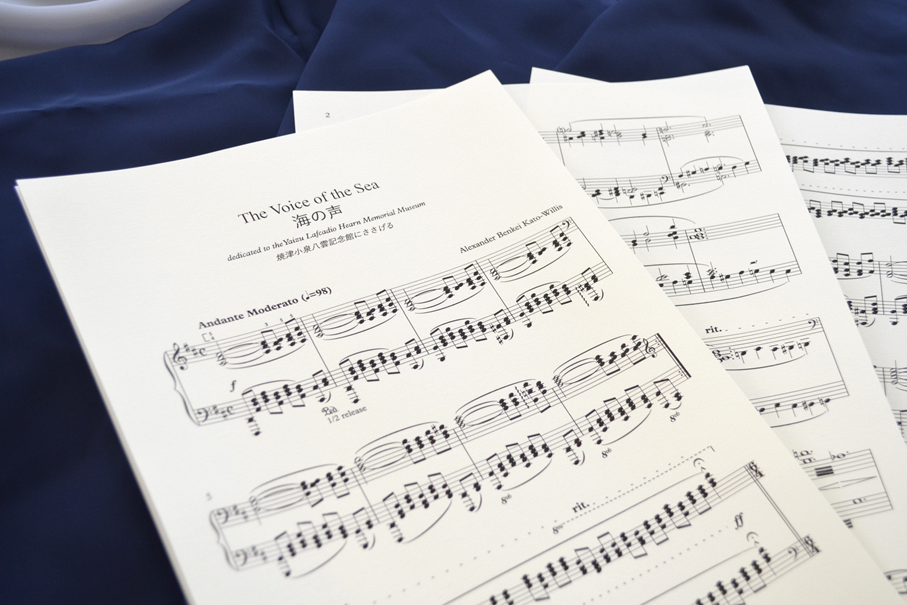 令和4年9月に即興ピアニストのアレギザンダー弁慶・加藤=ウィラス氏から、焼津小泉八雲記念館へピアノ曲「The Voice of the Sea(海の声)」が贈られました。八雲を敬愛する氏によって作曲された幽玄で壮大なピアノ曲は、寄せては返す波のさざめきや、時間や天候によって表情を変える焼津の海を想い起こさせます。本展覧会では、このピアノ曲を、焼津の海の写真や八雲の描いたスケッチ、八雲の著作である「焼津にて」の一節とともにご紹介します。