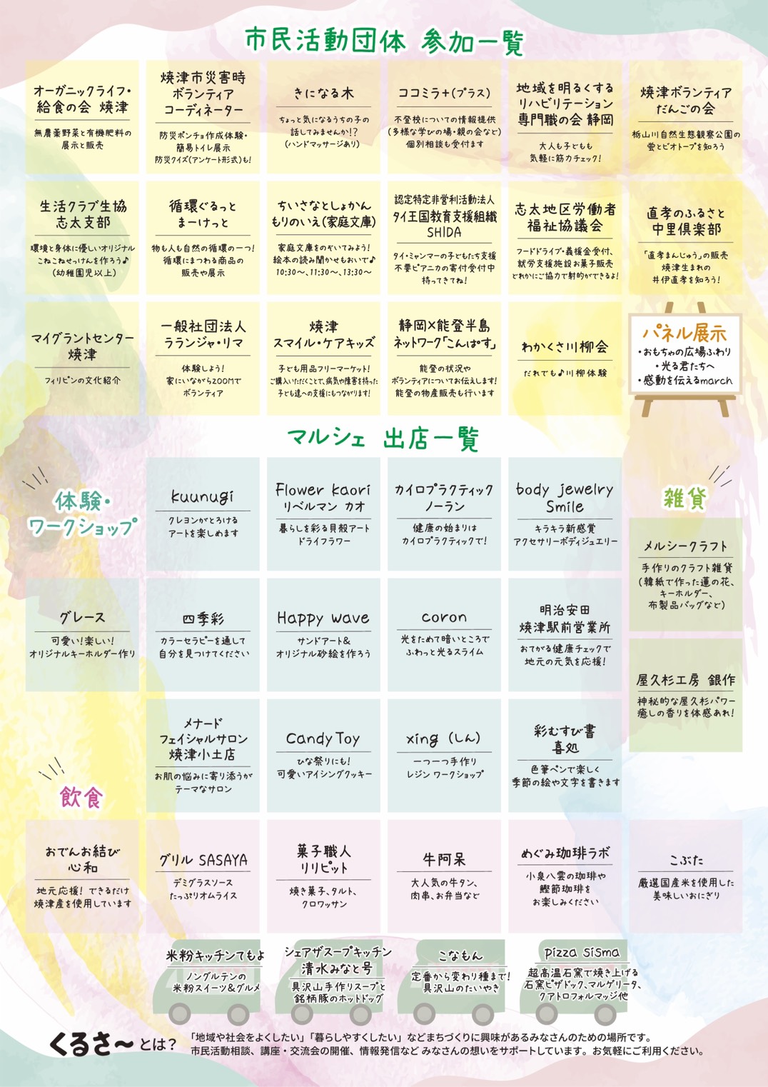 焼津市内の市民活動団体の活動を広く知っていただき、活動の輪が広がることを目的として「くるさ~やいづしみんマルシェ」を開催します。 市民活動団体によるステージ発表、発見・体験ブースとパネル展示の他、飲食、雑貨販売、ワークショップのマルシェ店舗が出店します。 子どもから大人までみんな楽しめます。ぜひお越しください。