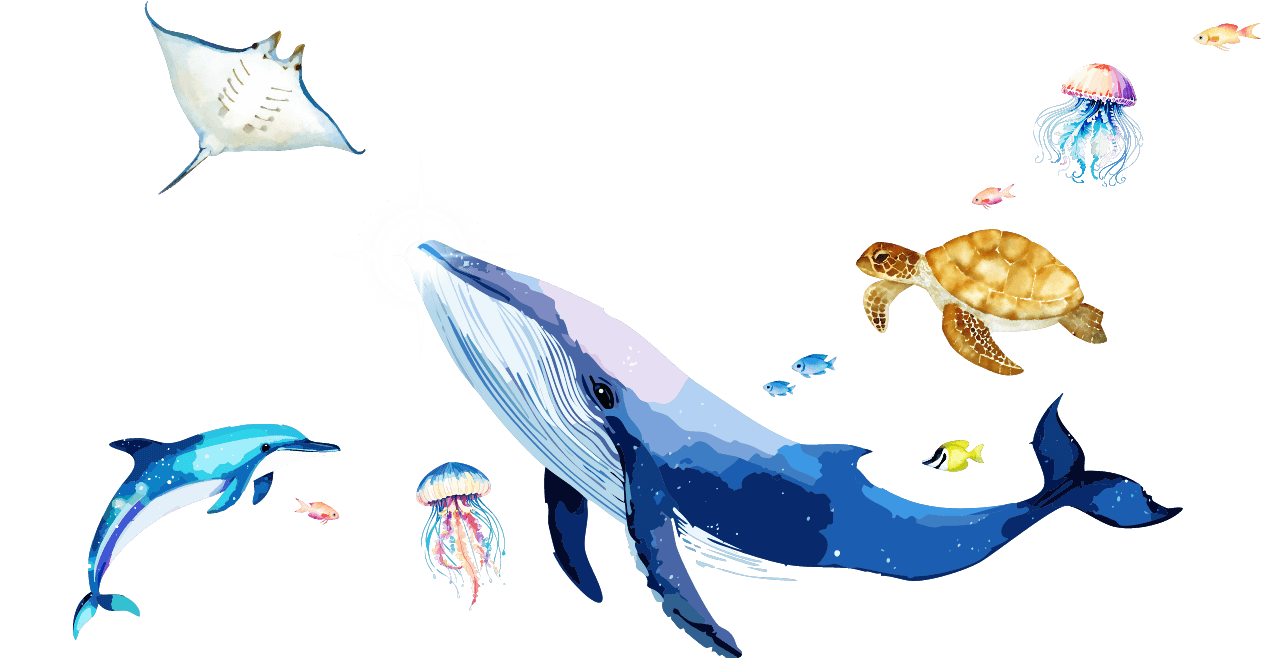 ⻘を基調にした光で、まるで海の中を漂う演出を展開し、⿂やカメたちのモチーフを通して、訪れた⼈々に癒しと驚きをお届けします。