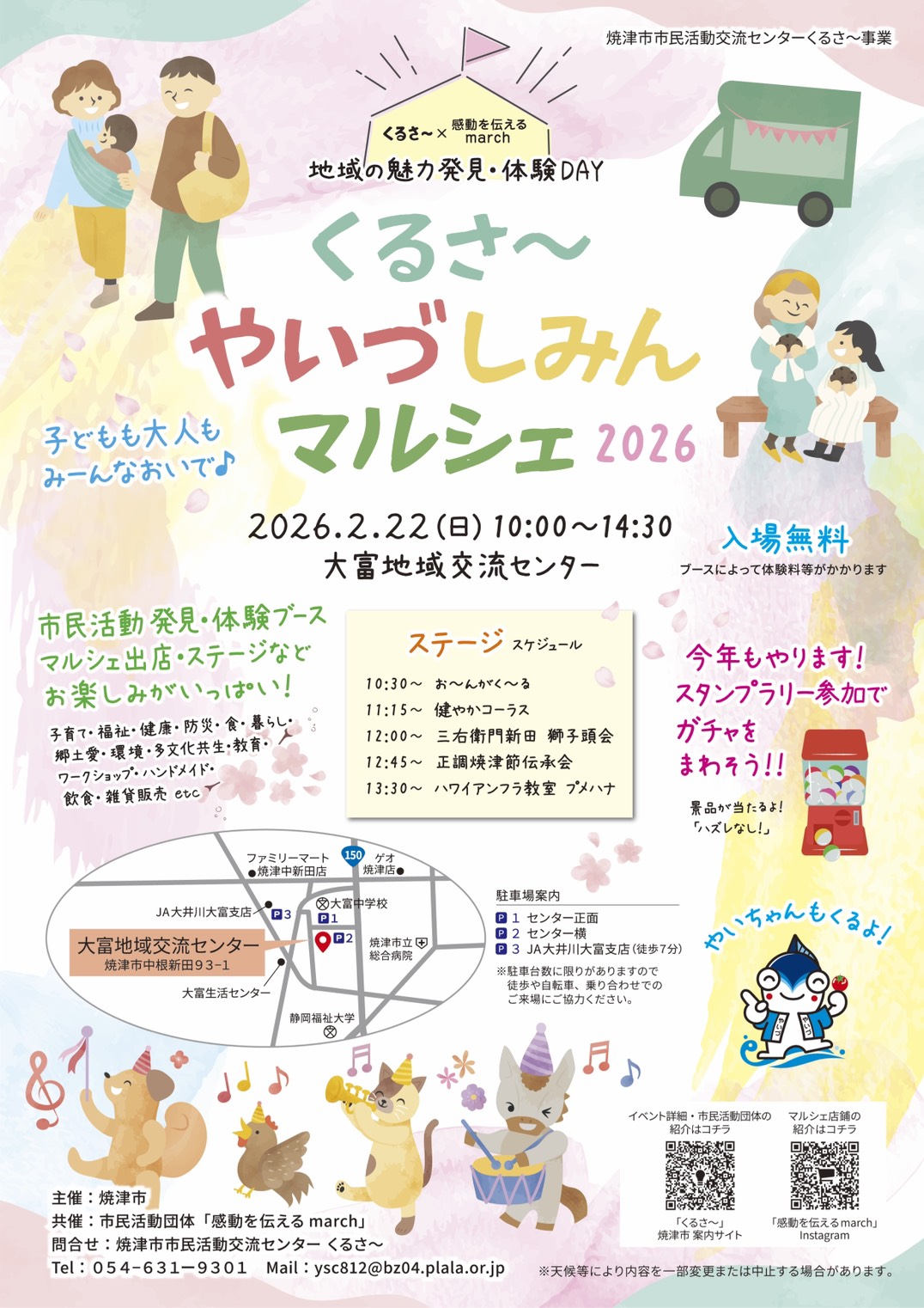 焼津市内の市民活動団体の活動を広く知っていただき、活動の輪が広がることを目的として「くるさ~やいづしみんマルシェ」を開催します。当イベントは、焼津を盛り上げるために、市内各地でマルシェを開催している市民活動団体「感動を伝えるmarch」とコラボして開催します。