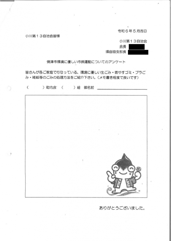 自治会内住民向けの組回覧にて、毎月「環境にやさしいライフスタイル」への転換を促すテーマを掲載したチラシを配布し、啓発しました。