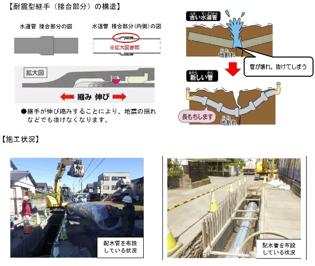耐震性のある新しい水道管は、耐震型継手と呼ばれる構造をしていて、地震で大きな揺れがあっても管が壊れにくくなっています。